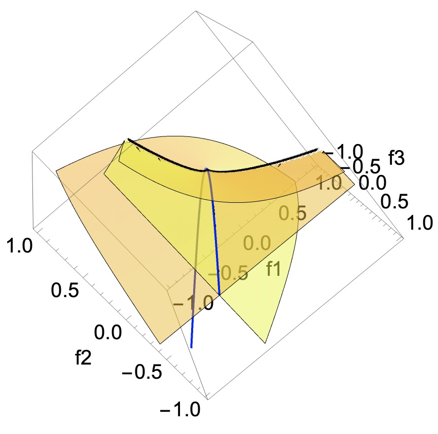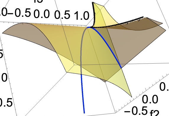SwallowtailFilm: Consider the univariate polynomial p(x) = x4 + a x2 + b x + c with parameters a, b, c (the cyan-colored curve in the plane which is located in the upper part of our film). It has a double root where both p(x) and its derivative p'(x) vanish. To determine for which a, b, c this happens, we eliminate the variable x from these two equations and obtain the so-called discriminant of p. Many articles have been written about discriminants; here, we focus on the example p(x) above which is well-known and even appears in many textbooks. The discriminant s(a,b,c) which is a polynomial of degree 5 in the variables a, b, c, is called the swallowtail. This is the pink surface in our film. Clearly, p(x) has a double root for those a, b, c for which s(a,b,c) vanishes. But s(a,b,c) holds much more information than that! Depending on the position of the point (a,b,c) relative to the swallowtail, we can see how many real roots the corresponding polynomial p(x) has and which multiplicity they have. Of course, the point (0,0,0) corresponds to the case for which the polynomial p(x) has a 4-tuple root 0. On the swallowtail, this is the most singular point. For smooth points (a,b,c) on the swallowtail, the corresponding polynomial p(x) has exactly one double root and either 0 or 2 simple roots depending on the location of the smooth point. Where the left and the right smooth part intersect transversally (i.e., in the lower middle part of our film), this happens twice and p(x) has two distinct double roots. On the real isolated half-parabola, which can be seen in the part of the film where the swallowtail rotates, these two distinct double roots are both complex (and thus complex conjugate). For points inside the triangular-shaped part of the swallowtail (i.e., in the center part of our film) p(x) has exactly four distinct real roots. On a smooth point of the part of the swallowtail which is the boundary of this triangular-shaped region p(x) has four real roots, two of which coincide. On the cuspidal edge of the triangular-shaped region, this happens twice but not symmetrically which means that p(x) has one tripled root and one simple root. This film was made by Oliver Labs using surfex. Parameter spaces of 3-band and 2-band non-Hermitian Hamiltonians Momentum spaces of 2-band Hermitian and non-Hermitian Hamiltonians Jaap Top and Erik Weitenberg, Resurfaced discriminant surfaces V.I. Arnold, Braids of algebraic functions and the cohomology of swallowtails, translated by Gerald Gould QuanSheng Wu, Alexey A. Soluyanov, and Tomáš Bzdušek, Non-Abelian band topology in noninteracting metals Biao Yang, Shuang Zhang, C.T. Chan, et al, Experimental observation of non-Abelian topological charges and edge states Charles L. Kane, Topological band theory |